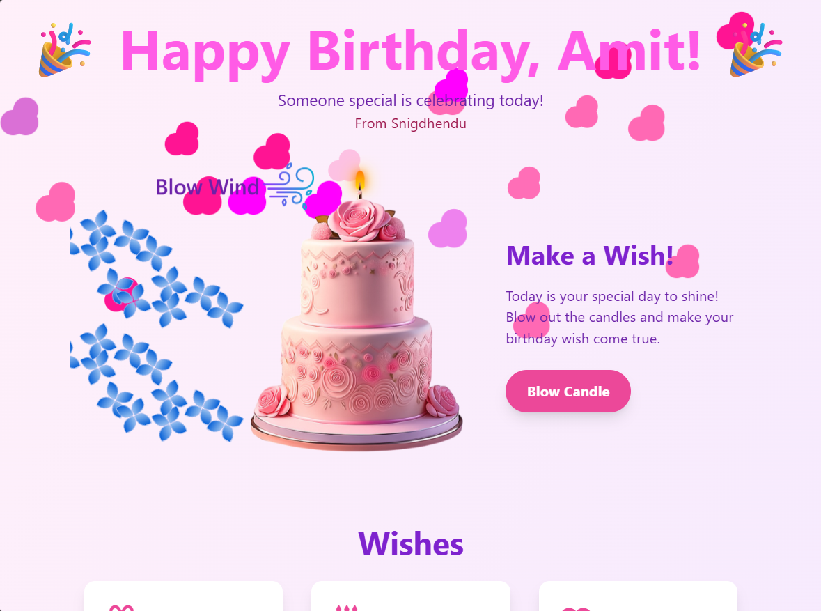 Interactive elements like blowing candles and floating animations for a fun experience.