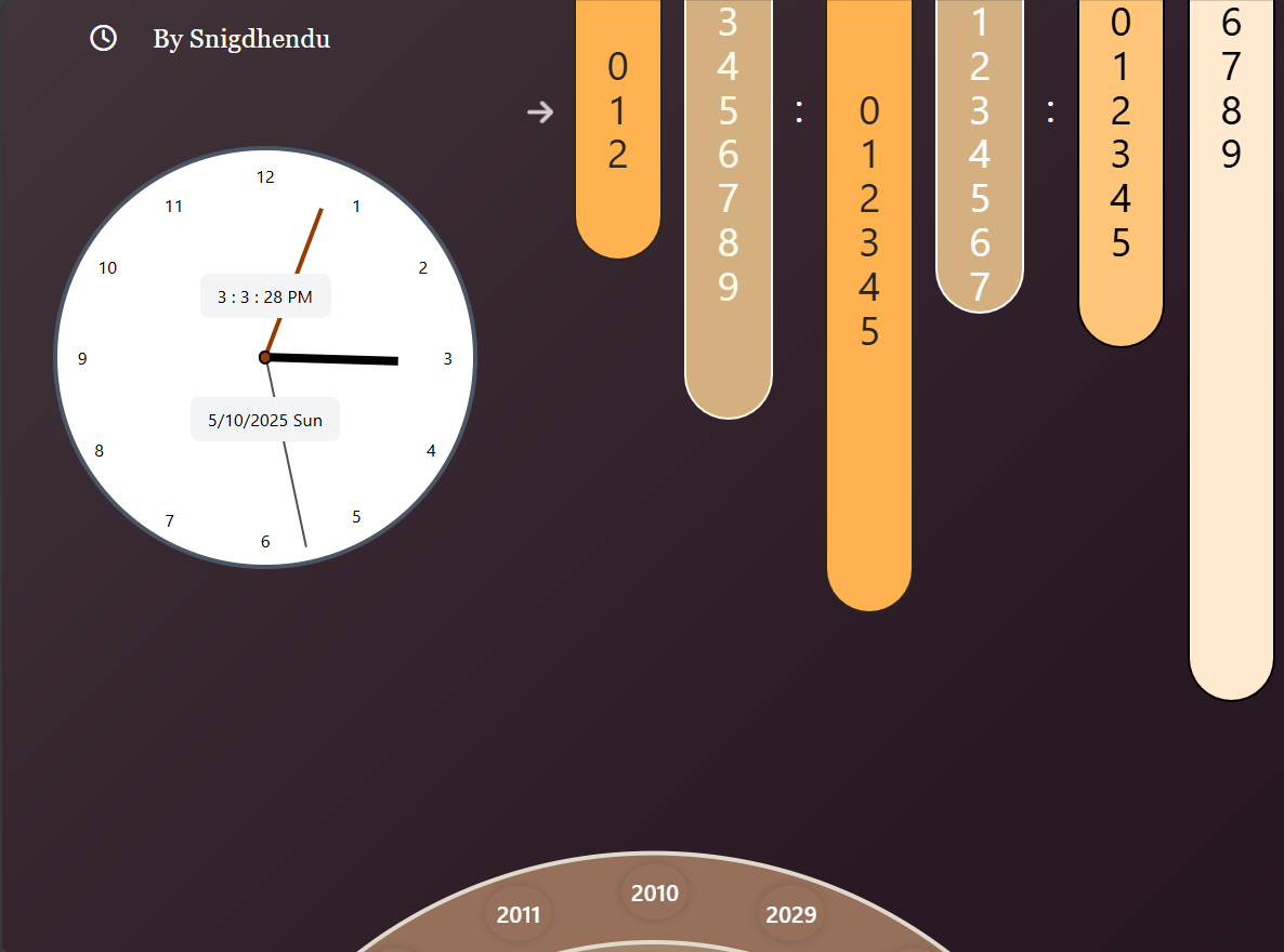 A creative digital clock webpage combining analog and digital time representation with smooth animations and elegant design.